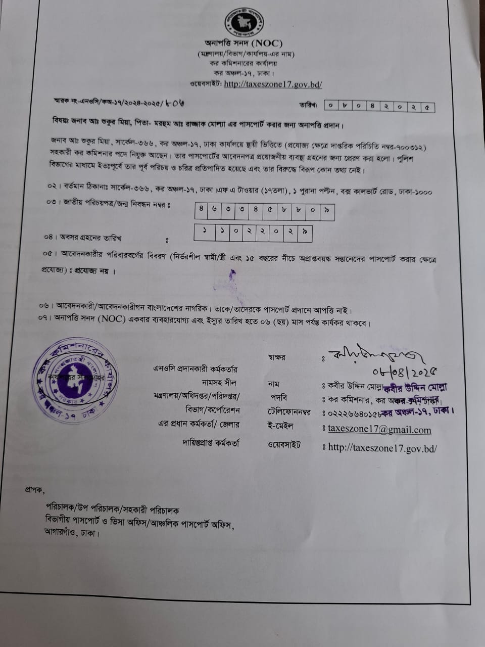 মিজ অন্তরা সরকার,অতিরিক্ত সহকারী কর কমিশনার এর পাসপোর্ট করার জন্য অনাপত্তি প্রদান | 2025-01-27 | |